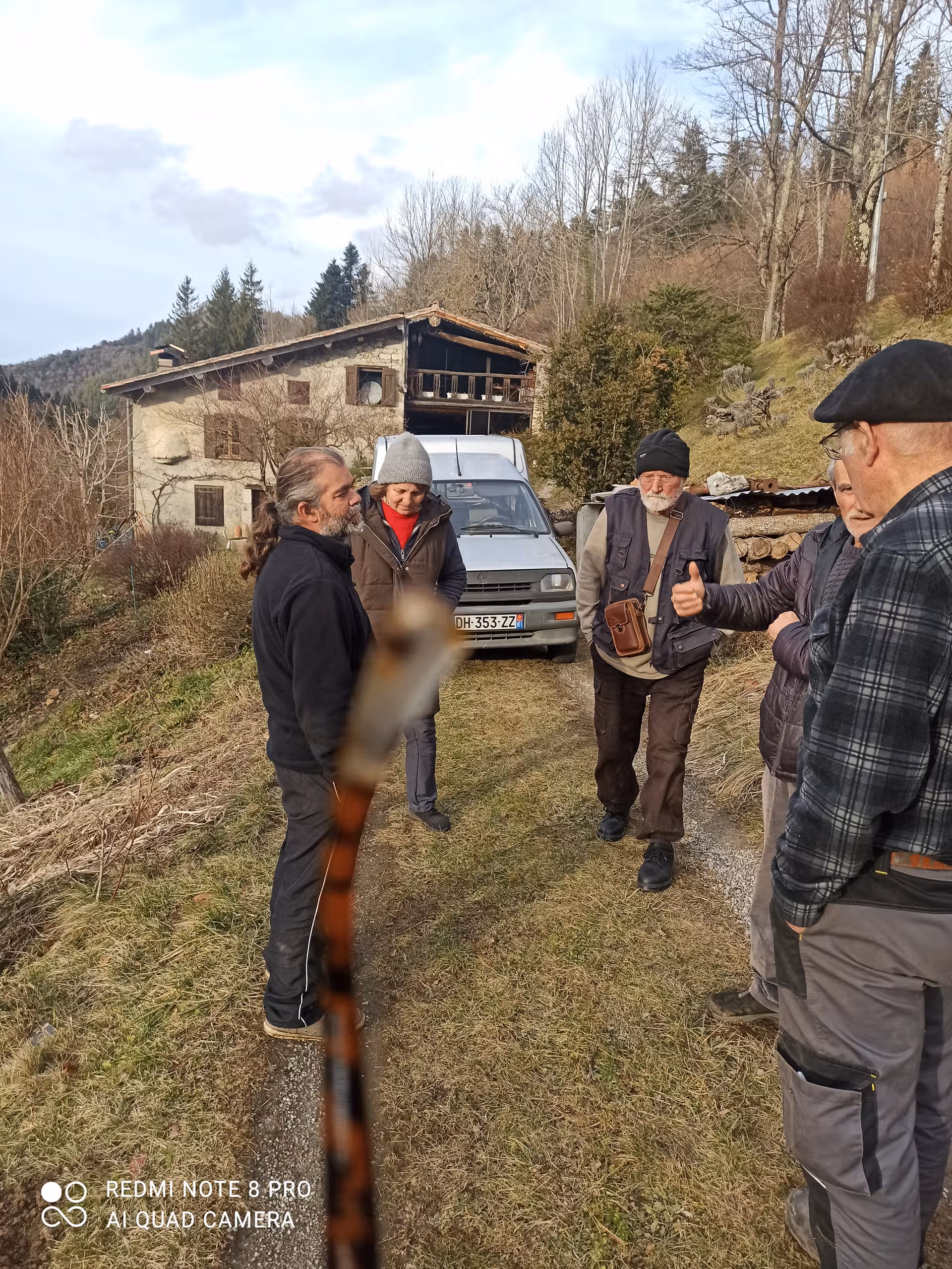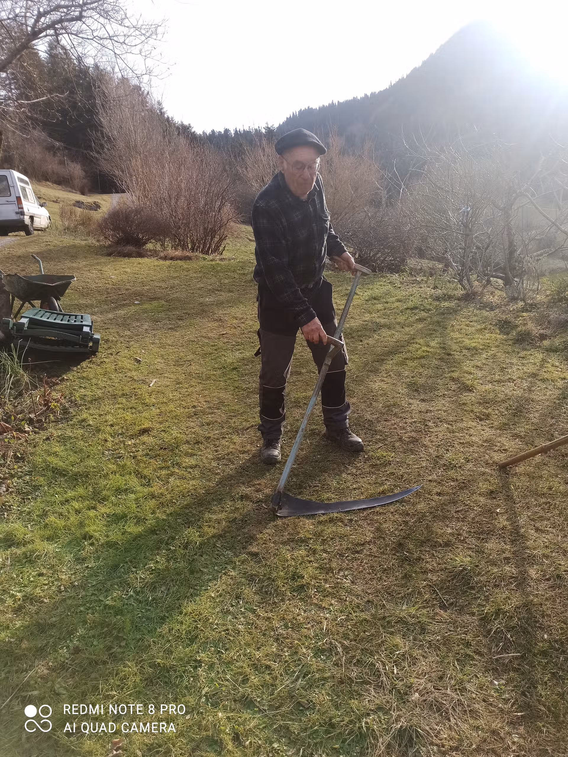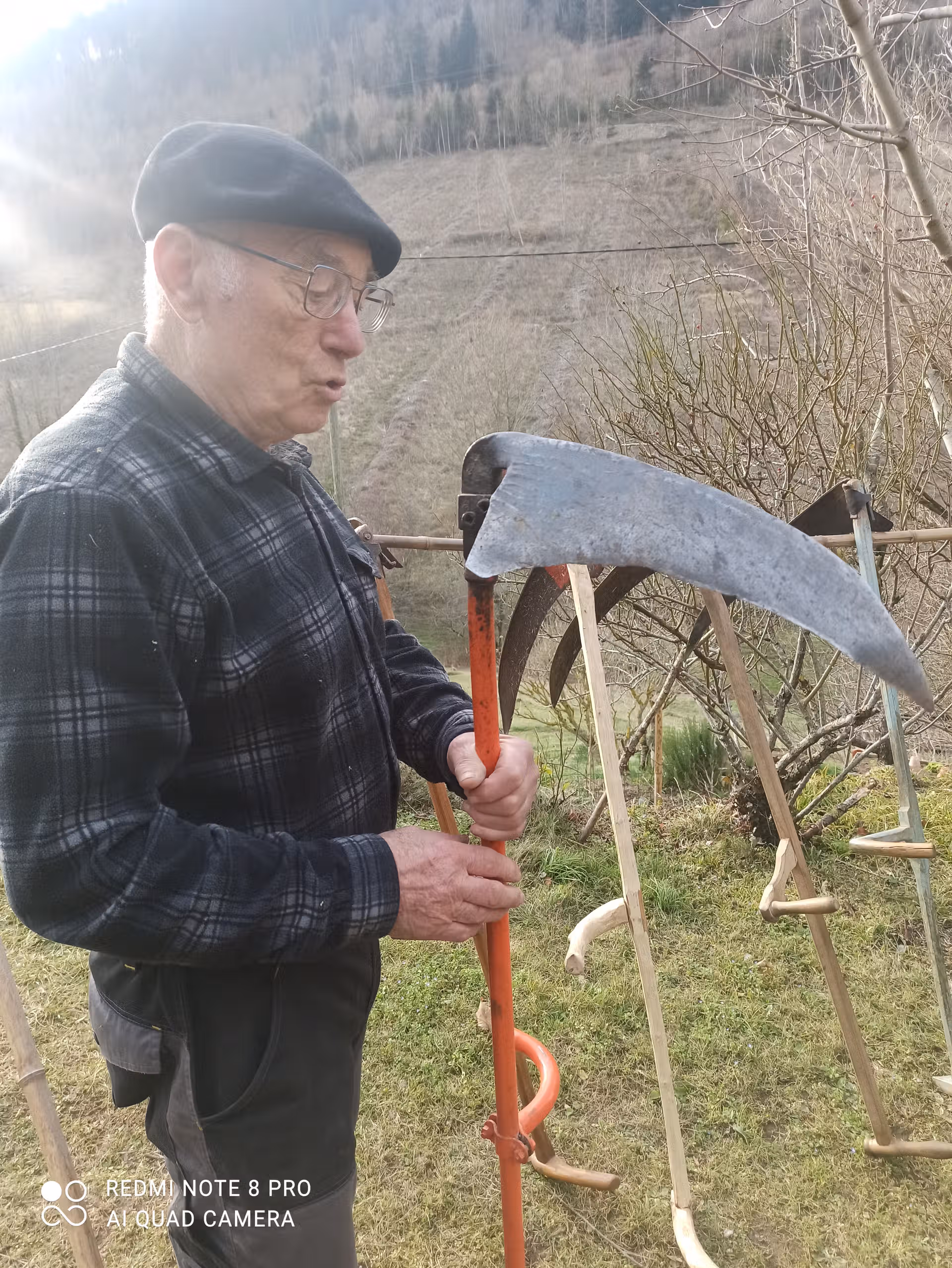 Mercredi 14 janvier, nous avons été gentiment invité par Paul Garrigue, dans sa superbe maison ariégeoise située dans le col de la Croix des Morts, pour nous montrer sa collection de faux anciennes et pour nous montrer leur maniement ainsi que son entretien. Il nous a d’abord fait visiter cette demeure ancienne où il réside. Une grande cheminée chauffe amoureusement la grande salle à manger. Elle est tellement vaste que Paul y a installé son bureau à l’intérieur. Paul est un érudit qui parle couramment l’occitan. Il connaît également de nombreux contes et histoires de la région qu’il va souvent raconter dans les écoles ou bien dans les manifestations locales. Il nous montre également d’anciennes machines et outils agricoles, car Paul connaît aussi toute les techniques anciennes d’élevage, d’attelage et de cultures paysannes. Il nous présente d’anciens colliers pour atteler les bœufs,ou les vaches ainsi que de nombreuses paniers faits par lui en vannerie. Nous nous retrouvons bientôt à l’extérieur devant sa collection de faux. il nous indique que toutes sont réglées pour être adaptées à sa taille, car il n’est pas indiqué de manier une faux trop petite ou bien trop grande par rapport à sa taille.Paul utilise ses faux car de nombreuses pentes herbeuses entourent sa maison.